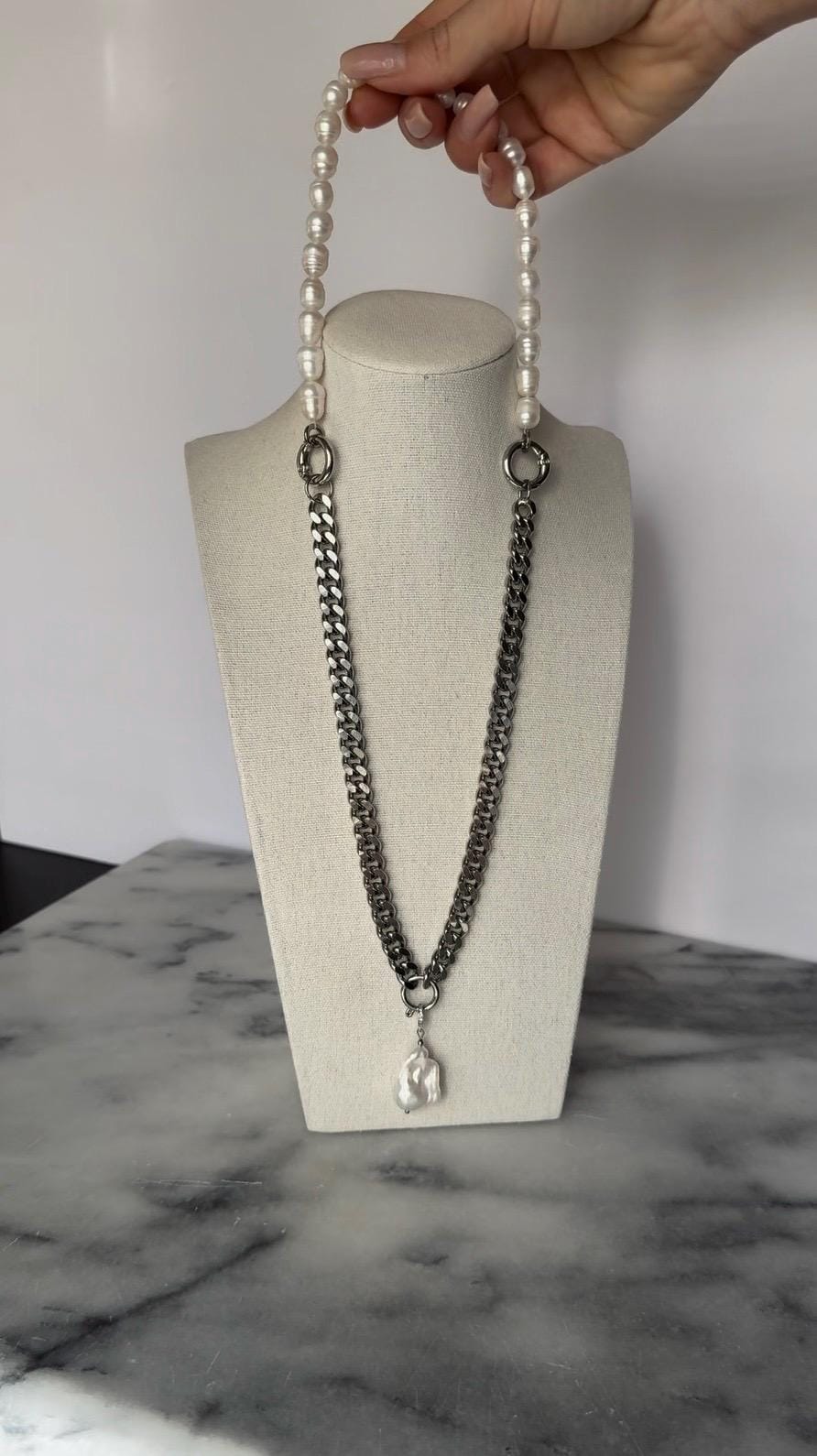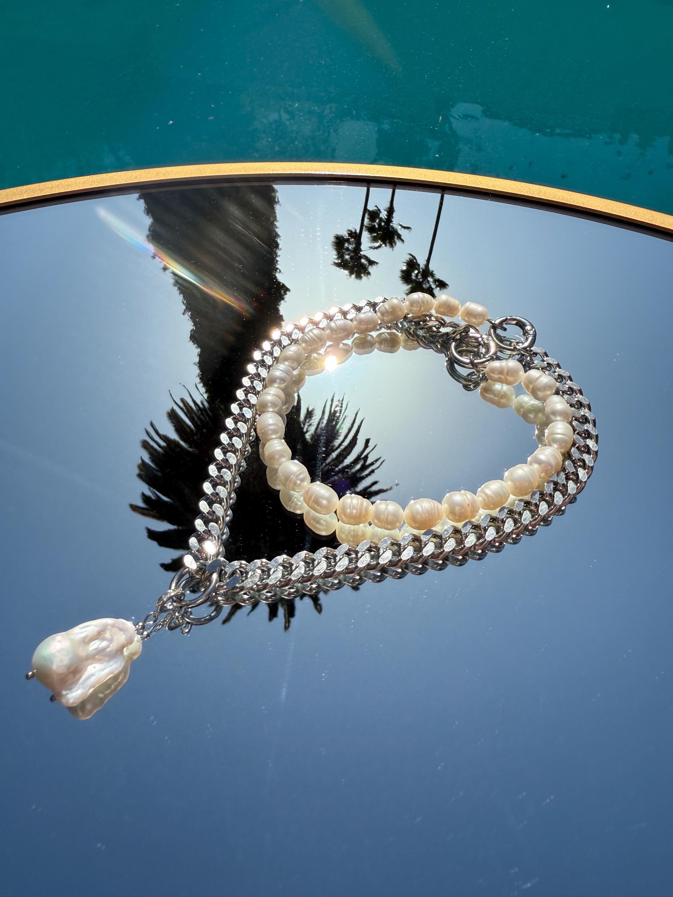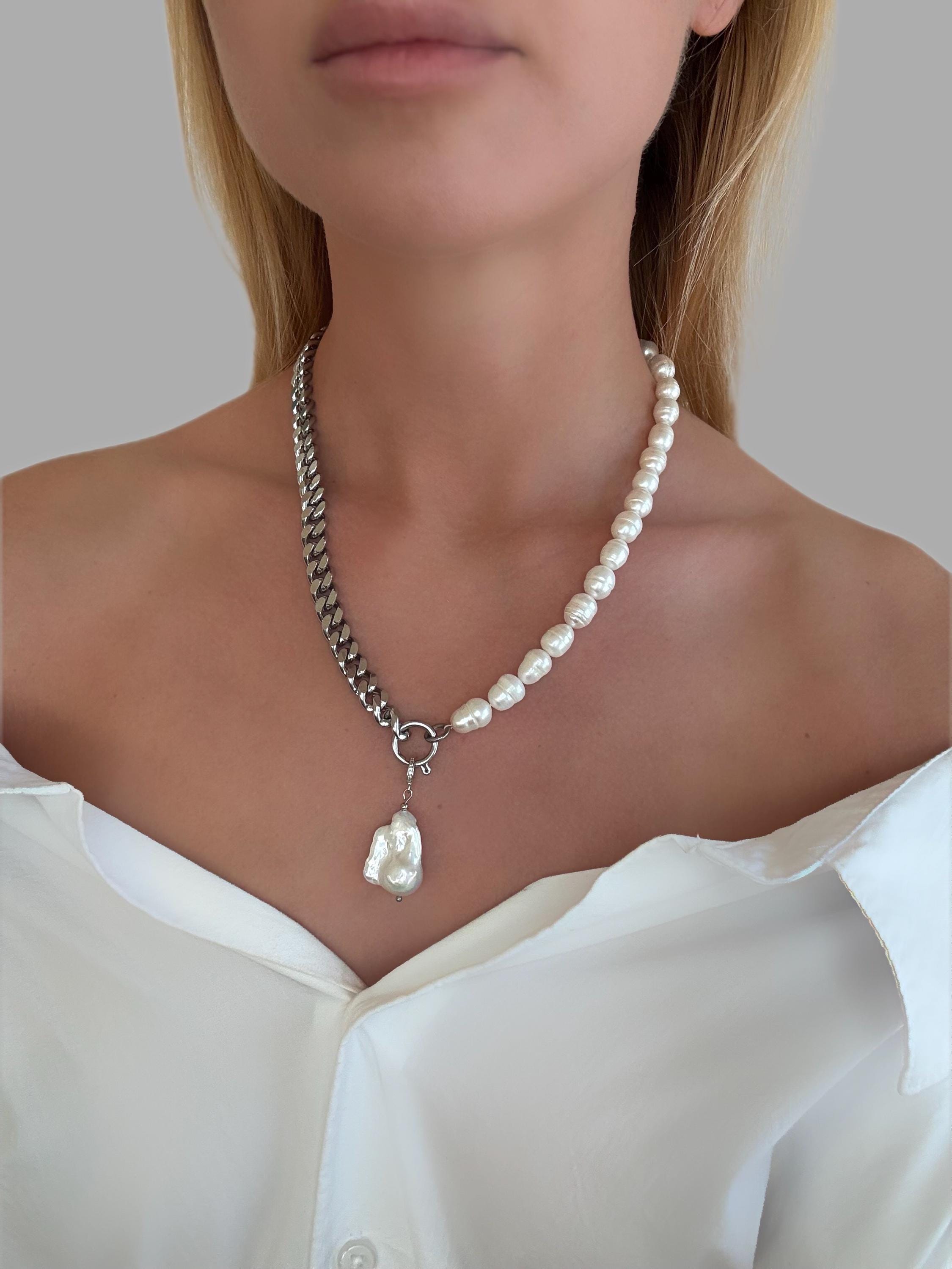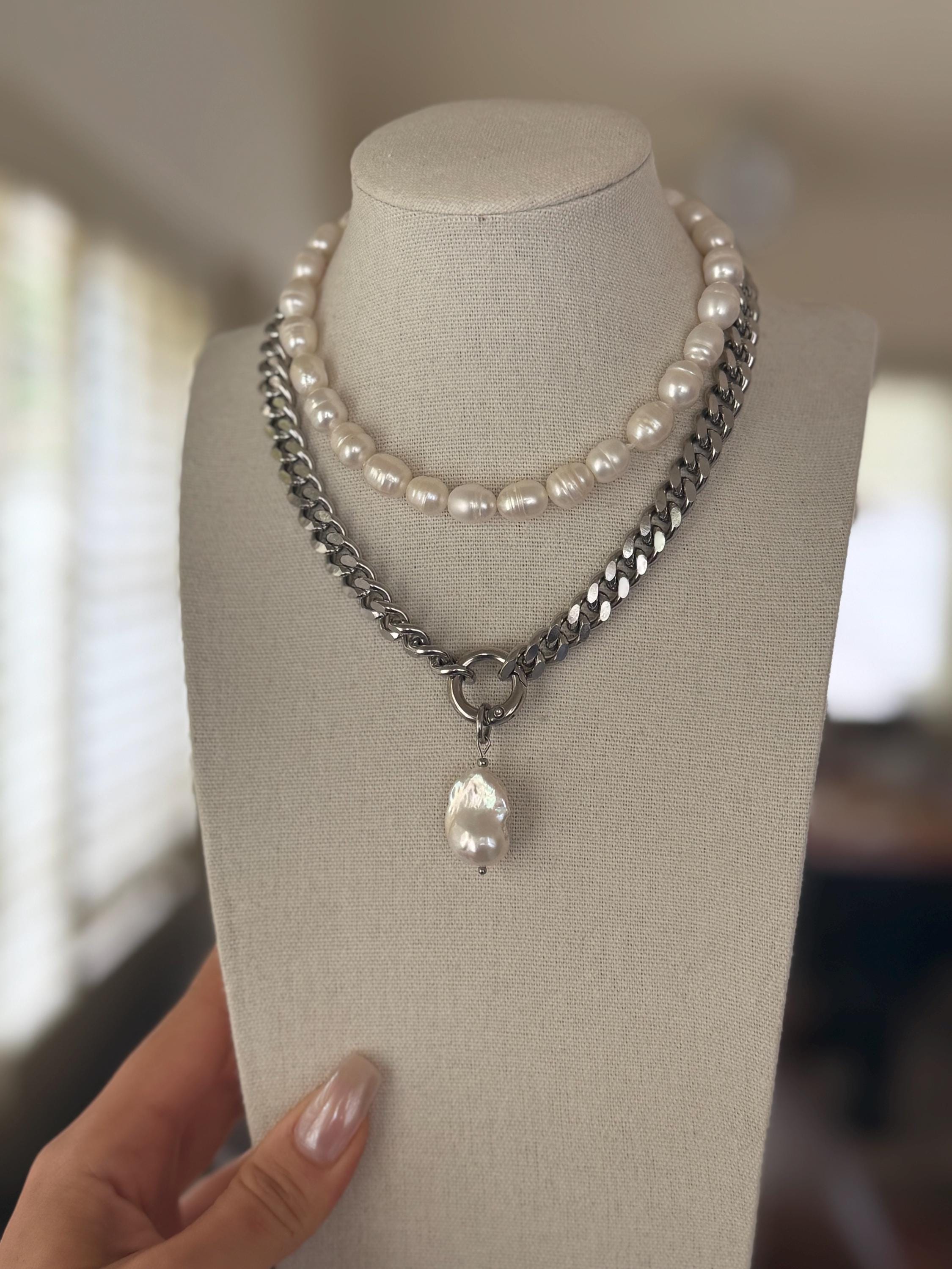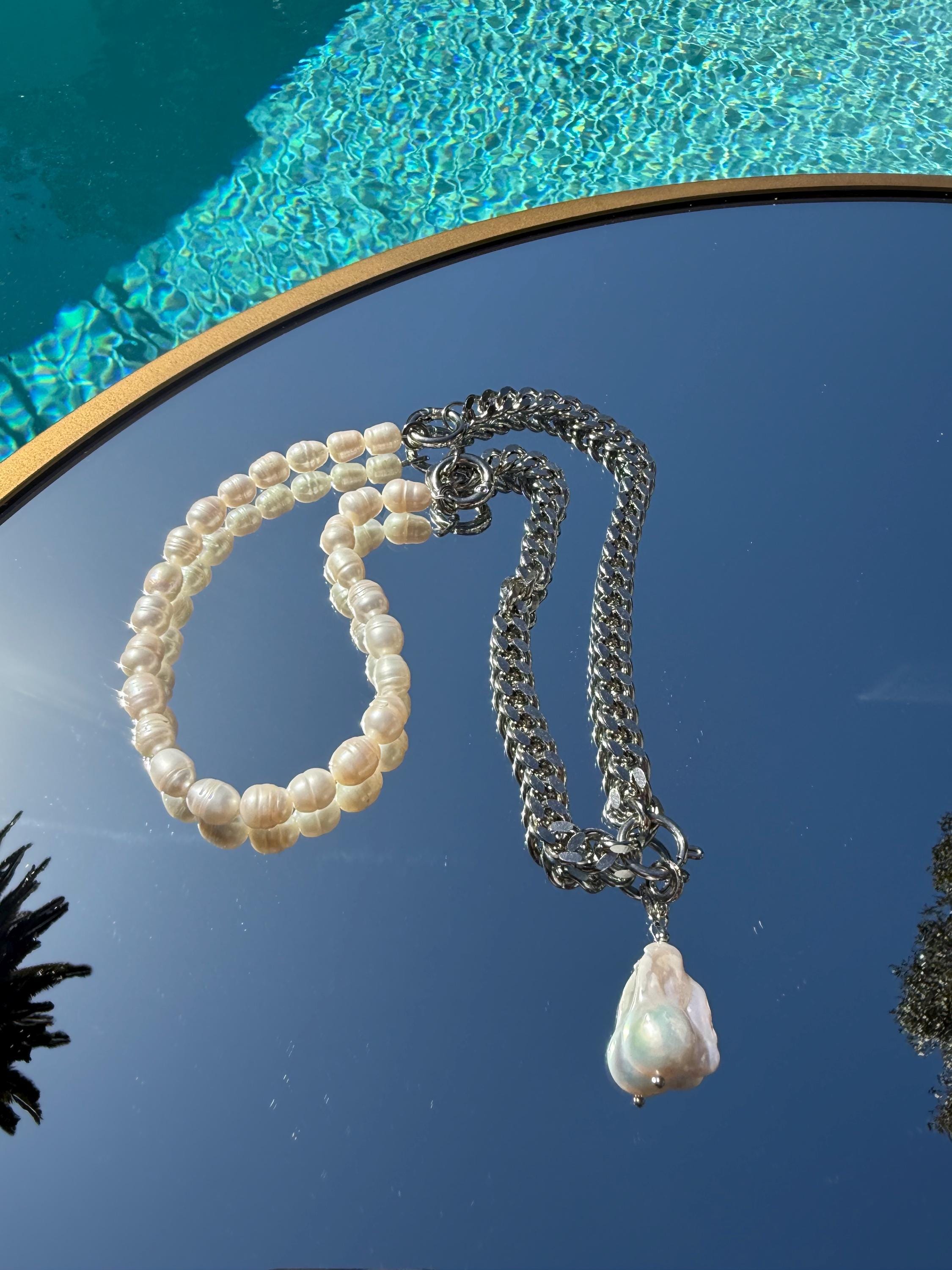 This unique necklace blends the classic beauty of natural baroque pearls with the boldness of a flat stainless steel curb chain. Featuring a removable baroque pearl pendant, this piece is your ultimate style chameleon – wear it: